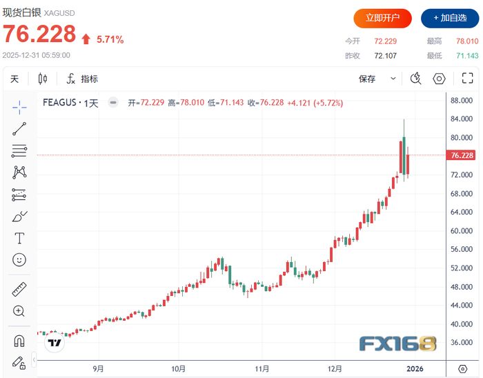 美市尾盘,现货白银上涨5.71%,收复前一交易日部分失地,收报76.228美元/盎司,日内稍早一度触及78.010美元/盎司高点。此前白银经历了自2021年以来最剧烈的单日下跌,反弹也凸显贵金属市场在年末阶段的剧烈波动特征。